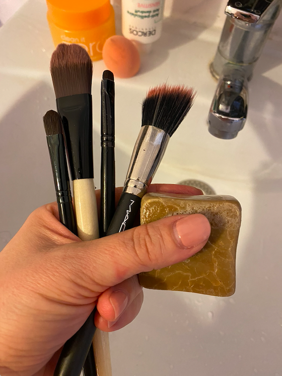 Curățarea pensulelor de machiaj: Spal toate pensulele sau buretii ca sa scap de reziduurile de machiaj fără sa deteriorez perii / buretii. Daca vorbim de pensule de pictura sau pe care le folosesc pentru reconditionari de mobile, tot cu savon de Marseille le spal si pe ele, indiferent daca am utlizat acrilic, produse de vopsit piele, dizolvanti, vopsea de ulei sau acuarela.